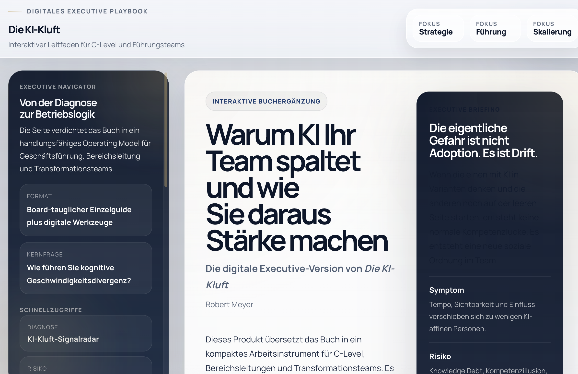 Die KI-Kluft zeigt, wie Sie aus stiller Divergenz einen strategischen Vorteil machen — mit klarer Sprache, belastbaren Formaten und einer Führungslogik, die in reale Teams passt.
