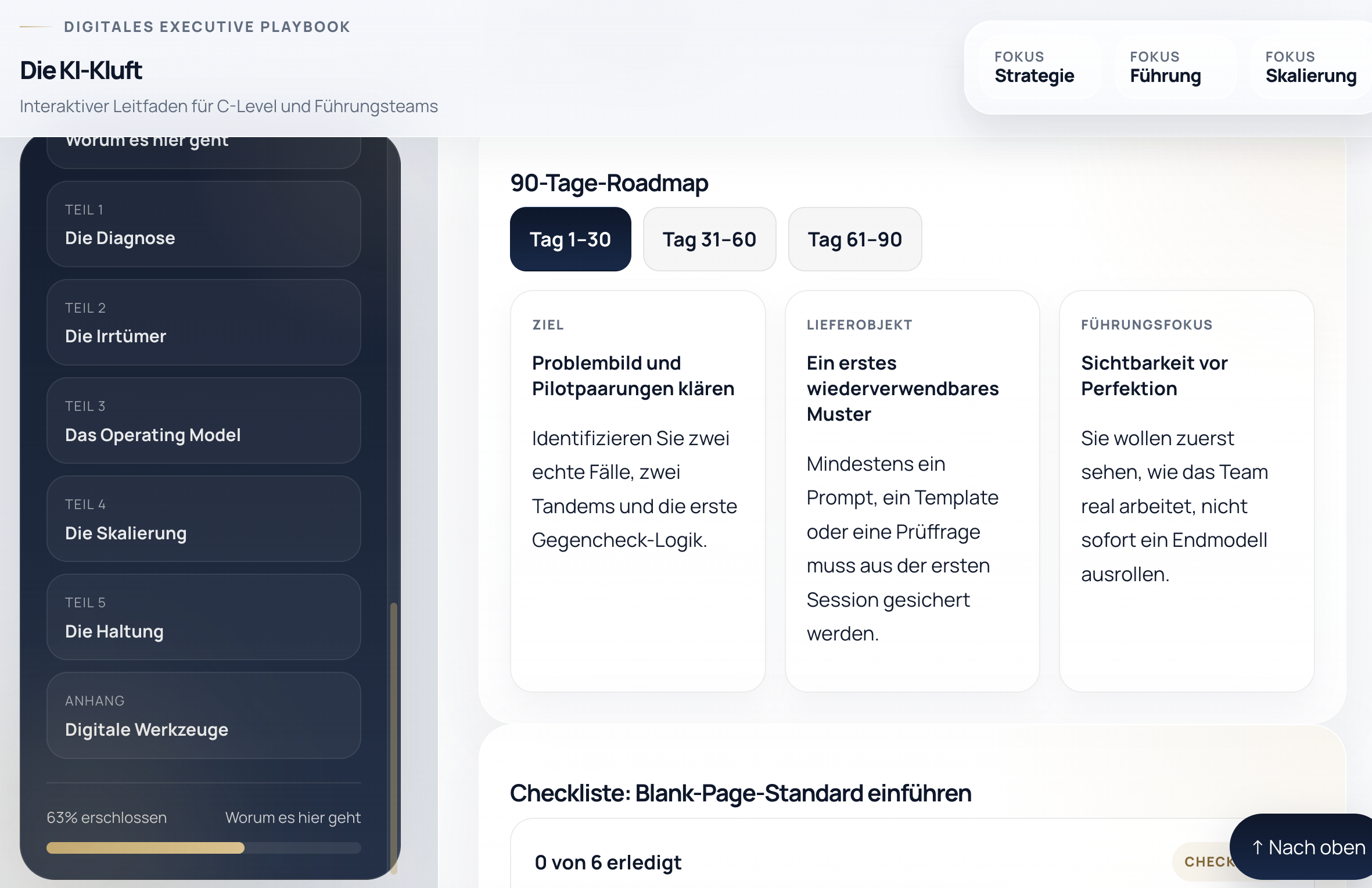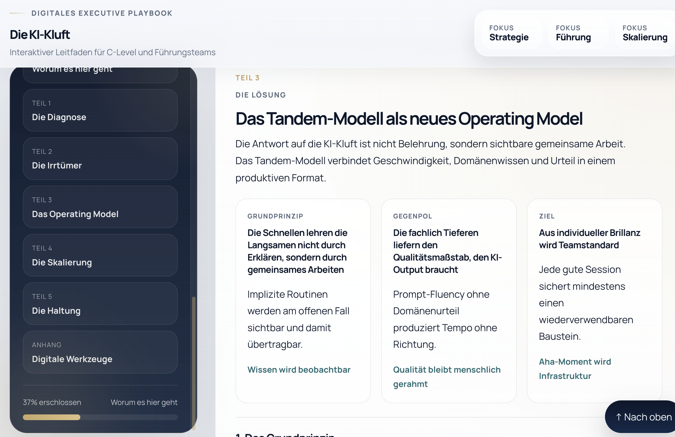 Statt nur zu lesen, arbeiten Sie mit verdichteten Diagnoseansichten, Executive-Checklisten, Umsetzungsrastern und digitalen Vorlagen für die Einführung des Tandem-Modells.
