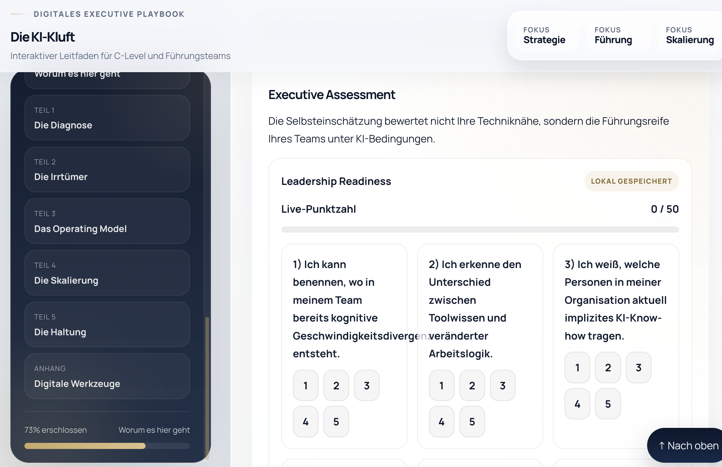 Das Buch liefert die Managementlogik. Die digitale Erweiterung übersetzt diese Logik in direkt nutzbare Werkzeuge: Diagnose, Checklisten, Vorlagen, Prompt-Bausteine und Umsetzungsroutinen für echte Teamsituationen.