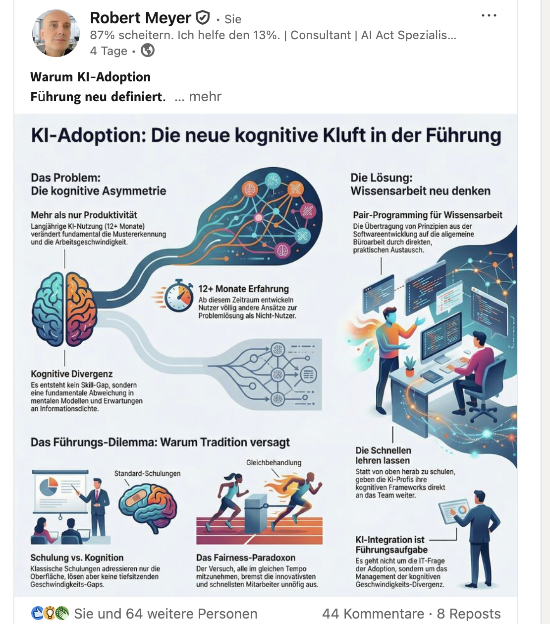 Genau hier setzt das Buch an: nicht mit Technikfaszination, sondern mit einer Managementfrage, die in Teams bereits wirksam ist. Der LinkedIn-Post ist deshalb kein Marketing-Baustein, sondern ein Beweisstück dafür, dass die Strategie des Buches an ein reales Führungsproblem anschließt.